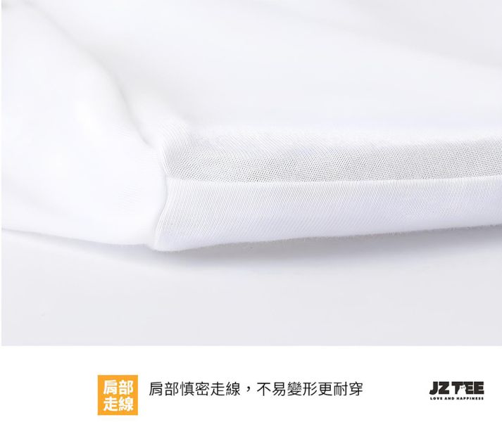 細節:羅紋領,壓肩條設計,雙針袖口與下擺,提縫剪裁防中心折痕。